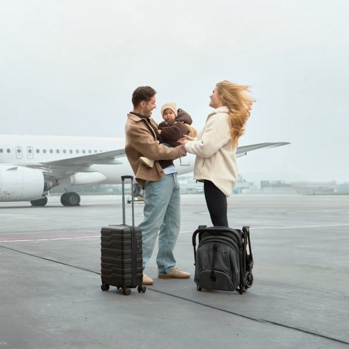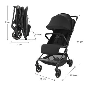 Mechanizmus skladania jednou rukou umožňuje rýchle zloženie kočíka aj v dynamických situáciách. Po zložení kočík samostatne stojí a jeho rozmery (51 × 43 × 21 cm) zodpovedajú štandardom príručnej batožiny, čo výrazne zvyšuje komfort cestovania.