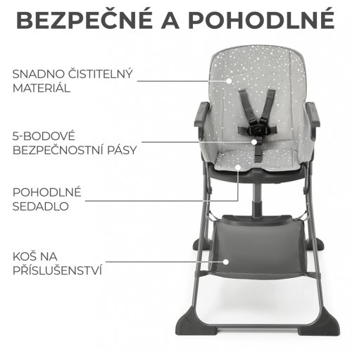 Najvyššia kvalita FOLDEE má veľké sedadlo, ktoré je vyrobené z ľahko umývateľného materiálu. Ľahko z neho odstránite aj tie najodolnejšie škvrny od jedla. Stolička je bezpečná: má 5-bodové nastaviteľné pásy, ktoré je možné v prípade potreby odňať a vyprať. Pod sedadlom je košík na drobnosti, ako sú vlhčené obrúsky alebo náhradný podbradník.