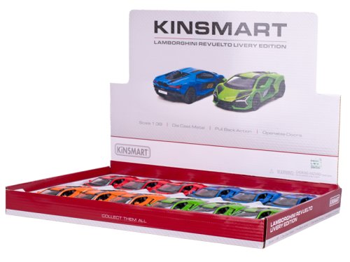 Kinsmart Lamborghini Revuelto 13 cm 1:38 kov spätný chod - mix farieb (oranžová, modrá, zelená, červená)