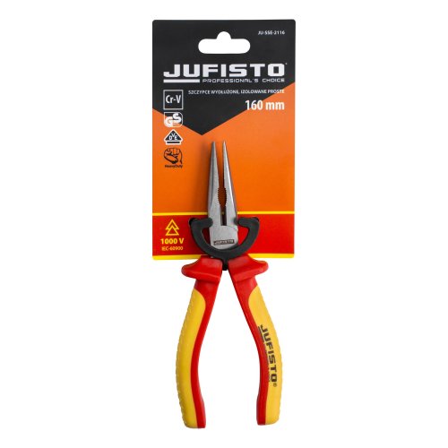 Izolované podlhovasté kliešte 160 mm / 6 ", 1000 V s certifikáciou VDE / GS. Materiál 60CrV w / leštené, kalené, tvrdosť ostrie cca 58-62 HRC. Dvojfarebná rukoväť TPE, možno použiť od -25 ± 3 stupňov do 70 stupňov.