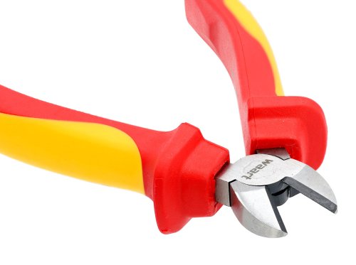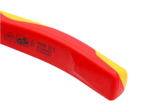 Izolované bočné kliešte 160 mm / 6 ", 1000 V s certifikáciou VDE / GS. Materiál 60CrV w / leštené, kalené, tvrdosť ostrie cca 58-62 HRC. Dvojfarebná rukoväť TPE, možno používať od -25 ± 3 stupňov do 70 stupňov.