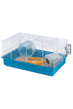Klietka disponuje domčekom, miskou, napájačkou a kolotočom na behanie.
