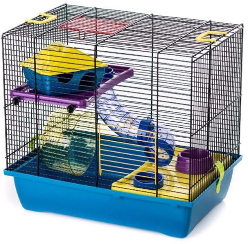 Vyššia klietka s plastovou výbavou vhodná pre škrečky a ďalšie drobné hlodavce. Vybavenie: 2 poschodia, domček, kolotoč, 1 miska, 2 menšie a 1 väčší tunel spojiteľné k sebe. Rozmery: 43 x 28 x 38 cm (šírka x hĺbka x výška)