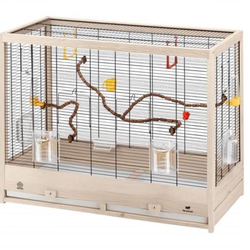 veľmi priestranná klietka, ktorá sa hodí aj do menších miestností výsuvnej vaničky na trus a nečistoty predné aj bočné dvierka vrátane výbavy vyrobená z dreva z obnoviteľných zdrojov ideálna aj pre viac vtákov