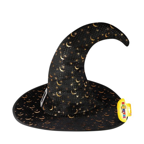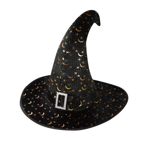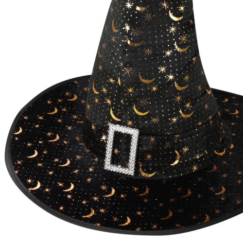 Štýlový čarodejnícky klobúk pre dospelých v čiernej farbe so zlatou potlačou a striebornou sponou. Staňte sa hviezdou karnevalového alebo halloweenskeho večierka vďaka tomuto neprehliadnuteľnému klobúku!