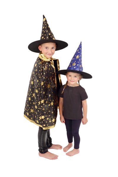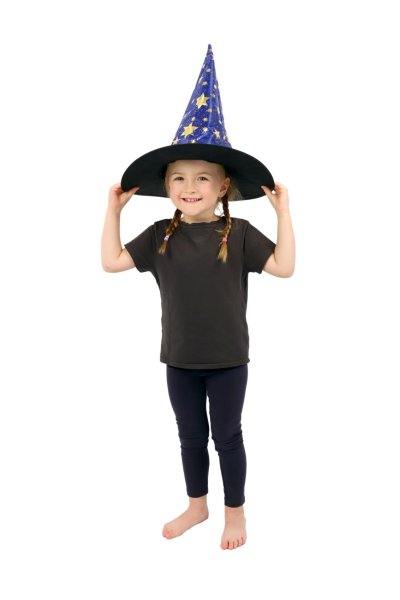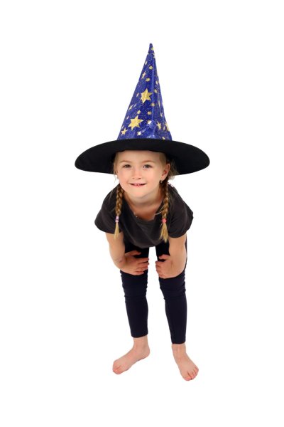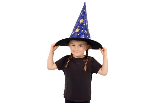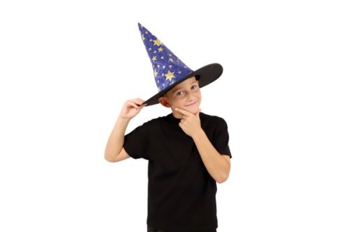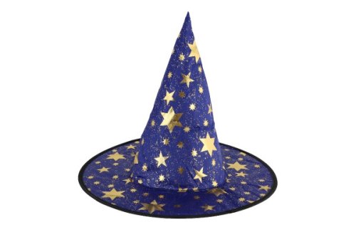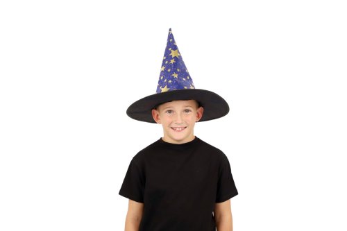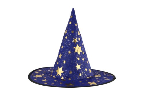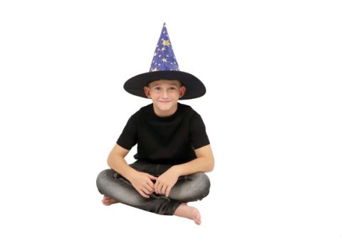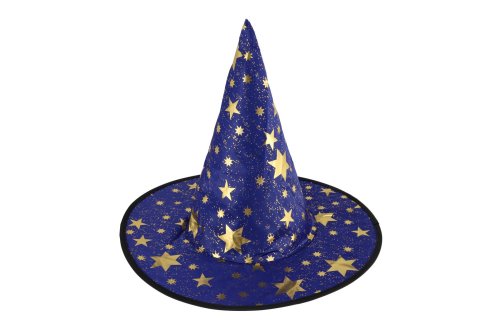 Detský čarodejnícky klobúk je inšpirovaný svetom kúziel a mágie. Je modrý a zdobený zlatými hviezdami, ktoré vzbudzujú čarodejnícky dojem. karnevalových a halloweenskych kostýmov.