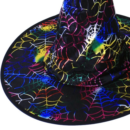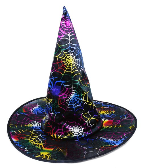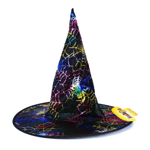 Karnevalový klobúk čiernej farby zdobený farebnými magickými pavučinami je určený pre dospelých.