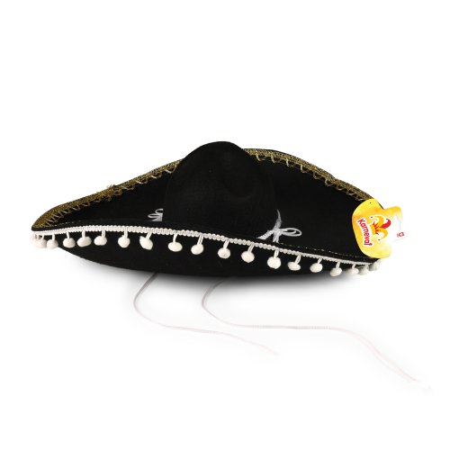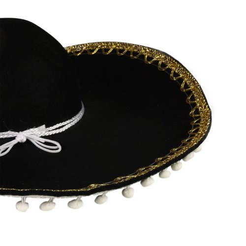 Čierne sombréro s bielymi brmbolcami a so šnúrkou je slušivý doplnkom ku kostýmu Mexičana. Čierne sombréro môžete nosiť ako súčasť mexického kostýmu alebo kostýmu na tému západu. Tento klobúk Vám dodá autentickosť a pôsobivý vzhľad.