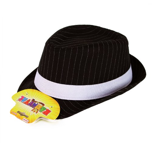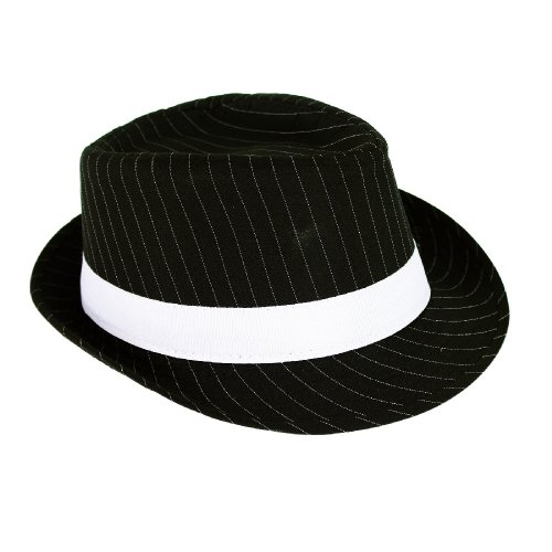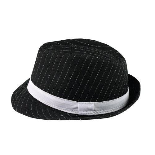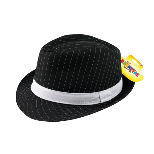 Štýlový klobúk pre dospelých! Tento elegantný kúsok v čiernej farbe s tenkým bielym prúžkom a zdobený stuhou je vysoký 12 cm. Skvele sa hodí ku kostýmu, alebo ako skvelý doplnok na vašu párty.