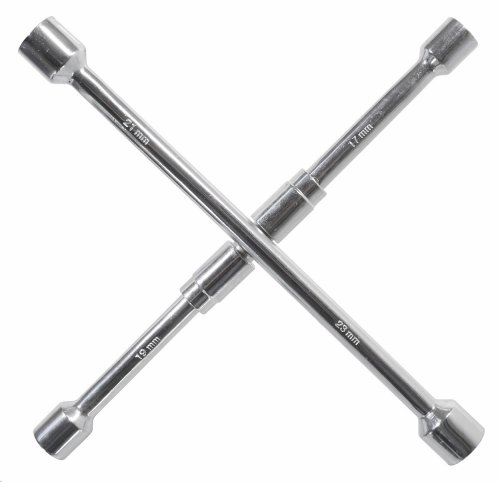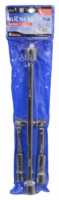 Skladací celokovový kľúč v tvare kríža značky Compass je určený na povoľovanie / uťahovanie matíc a skrutiek kolies automobilov. Na koncoch sa nachádzajú nástavce s rozmermi 17, 19, 21 a 23 mm.