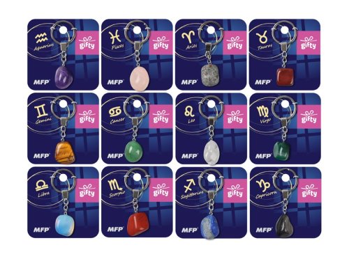 Display s 36 kľúčenkami Zodiac z kolekcie Gifty predstavuje kompletnú kolekciu inšpirovanú znameniami zverokruhu. Každé znamenie je zastúpené tromi jedinečnými kľúčenkami, ktoré zdobia ručne opracovaný prírodný kameň, dokonale vystihujúci charakteristiku daného znamenia. Vďaka kvalitnému kovovému krúžku je možné kľúčenku ľahko pripevniť na kľúče, tašku alebo batoh. Tento elegantný a praktický doplnok je nielen krásnym talizmanom, ale aj skvelým darčekom pre všetky vekové kategórie. Je vhodná na každodenné nosenie a súčasne má hlbší vý znam. , 3 x Rak - avanturín, 3 x Lev - krištáľ, 3 x Panna - achát, 3 x Váhy - opaliť, 3 x Škorpión - jaspis, 3 x Strelec - lapis lazuli, 3 x Kozorožec - obsidián)UPOZORNENIE: Vzhľadom na prírodný pôvod kameňov sa ich tvar, veľkosť a farba môžu mierne líšiť, čo podčiarkuje ich jedineč nosť.Uvedená cena je za 1 balenie.