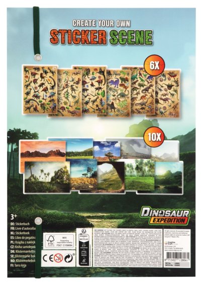 Kniha samolepiek Dino + 10 obrázkov v balení nájdeš 6 aršíkov samolepiek s dinosaurami a 10 obrázkov krajiny veľkosti A4. Nalepuj samolepky na obrázky a urob si tak vlastnú scenériu.