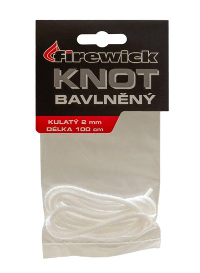 Knôt lampový FIREWICK. Guľaté bavlnené knôty sa používajú podľa použitého priemeru do všetkých typov lámp, vrátane lámp petrolejových a záhradných pochodní. Rozmery: priemer 2 mm, dĺžka 100 cm.