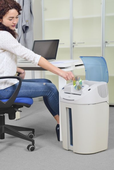 Dva podávacie otvory umožňujú vkladanie papiera na prednej strane a CD/DVD či kreditných kariet pod priehľadným vekom. Skartovaný materiál sa automaticky rozdeľuje do dvoch integrovaných vyberateľných nádob bez potreby plastových vakov.