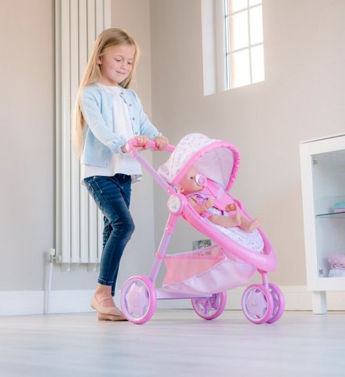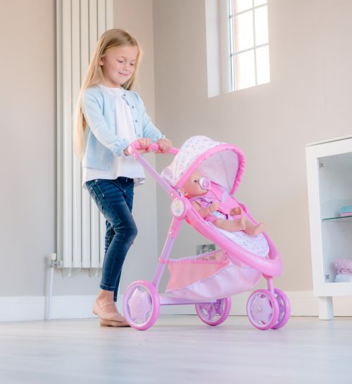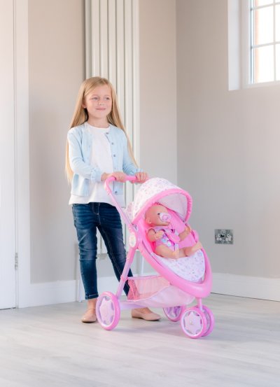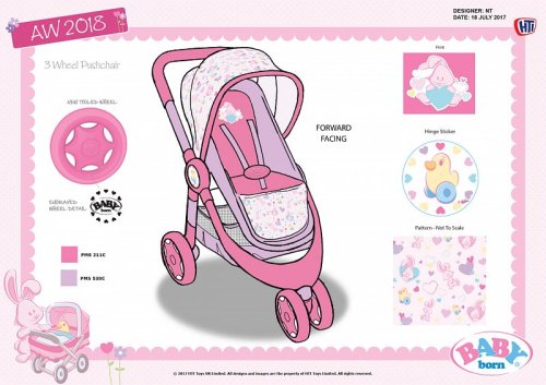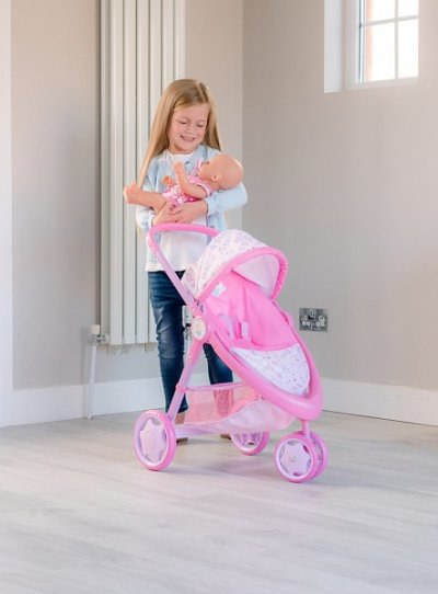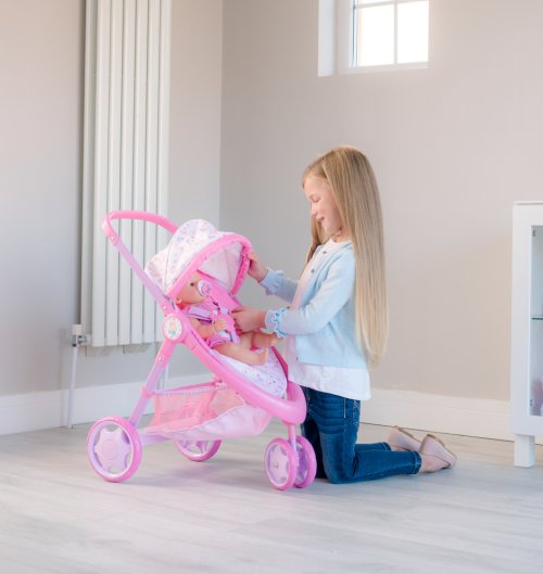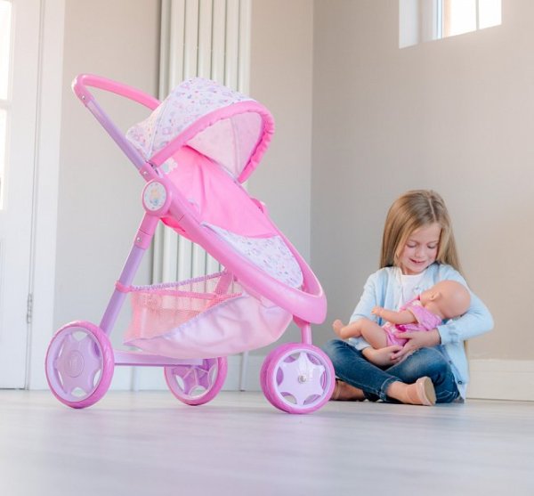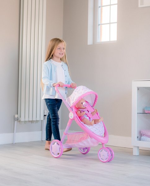 Krásna trojkolka Baby Born s plne nastaviteľnou búdkou, praktickým košíkom na doplnky pre bábiky a opierkou na nohy. Kočík má pohodlnú penovú rukoväť s výškou 59 cm. Predné dvojité koliesko je otočné pre ľahšie ovládanie kočíka. Kočík je v ružovom prevedení s obrázkami roztomilého zajačika a perfektne sa hodí pre všetky bábiky ktorých výška nepresahuje 43 cm. Sada neobsahuje bábiku. Rozmer balenia: 35,5 x 53,5 x 13 cm. Vek: 3+