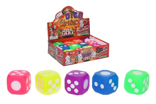 Kocka hracia. Veľkosť 4 cm. Svetelné efekty, batérie nemožno meniť. 12 ks display box. 6 variant - oranžová, modrá, zelená, žltá, fialová, ružová.