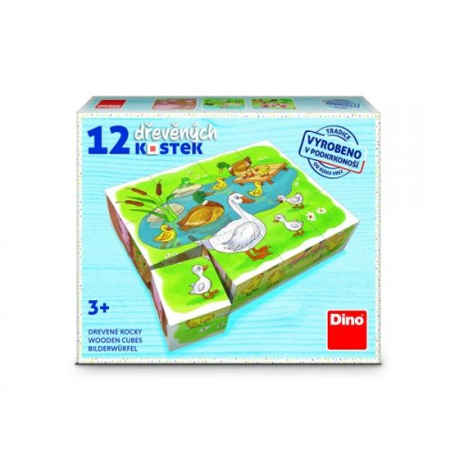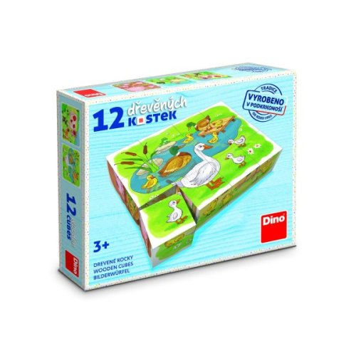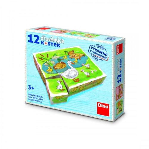 Detské drevené kocky, z ktorých je možné zostaviť 6 rôznych obrázkov. Balenie obsahuje 12 kociek. Vek: 3+