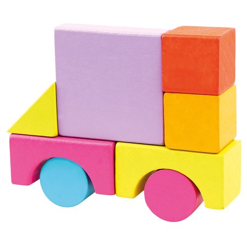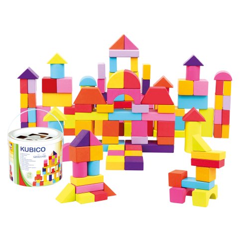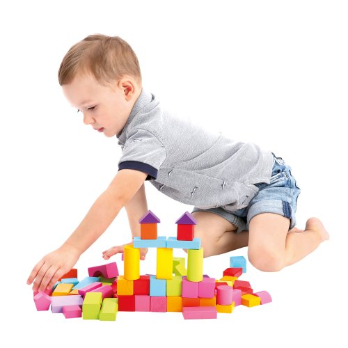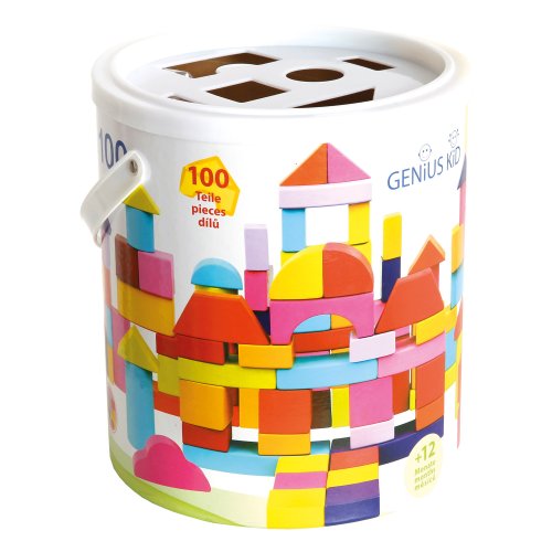 Kocky jasných atraktívnych farieb a rôznych tvarov v praktickom vedierku z kartónu. Veko vedierka premení balenie na hravú vkladačku, môže tak ďalej rozvíjať rozpoznávanie tvarov a jemnú motoriku. Hlavné vlastnosti: vkladačka so 100 kockami praktické balenie