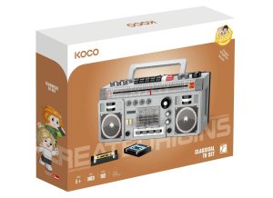 KOCO Stavebnica Kazetový prehrávač 1982 dielikov. Rozmery 18,5x7,5x14,5 cm. Súčasťou 2 figúrky. Obrázkový návod na zostavenie súčastí.