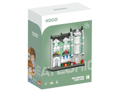 KOCO Stavebnica Obchod s potravinami 329 dielikov. Rozmery 8x3x9 cm. Obrázkový návod na zostavenie súčastí.