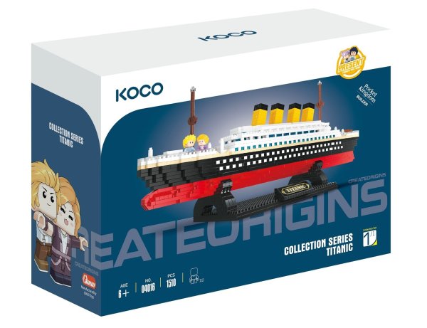 KOCO Stavebnica Titanic 1510 dielikov. Rozmery 35x8x14,5 cm. Súčasťou 2 figúrky, stojan. Obrázkový návod na zostavenie súčastí.