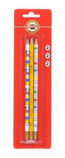 Okrúhle ceruzky v drevenom plášti s grafitovou tuhou v gradácii č. 2/HB. Ceruzky sú s gumotypovým nástavcom a po troch kusoch sú balené v blistri. Potlač na ceruzkách s motívom: puzzle, malá násobilka a vzorce sú vhodné pre všetkých školákov.