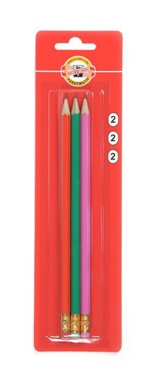Šesťhranné ceruzky v drevenom plášti s grafitovým jadrom v gradácii 2/HB. Ceruzky sú v troch odtieňoch povrchovej úpravy a majú 3 odtiene gumotypov, balené po 3 ks (mix) v blistri. Hodí sa na univerzálne použitie.