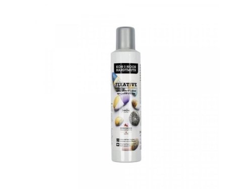 JE IDEÁLNY PRE FIXÁCIU RÔZNYCH POVRCHOV kameňa, dreva i papiera, nafarbeného textilu, sušených i umelých kvetov, výrobkov z Keraplastu . o rozpúšťadlový roztok špeciálnej živice v spreji slúžiacej na fixáciu povrchu kresieb nakreslených textilu, kamienkov alebo inými výrobkami z nášho umeleckého sortimentu. Zabraňuje sprašovaniu kresieb z podkladu, obmedzuje ich oter a zvyšuje ich UV odolnosť. Tryska vytvára neobyčajne jemný aerosól, ktorý používateľovi umožňuje rovnomernú a dokonalú aplikáciu roztoku. Niektoré biele či pastelové odtiene môžu po fixácii čiastočne strácať sýtosť . Sprej sa aplikuje rovnomerným krížovým nástrekom na povrch zo vzdialenosti asi 30 cm spravidla v štyroch alebo viacerých vrstvách. Obsahuje UV filter. Balenie v spreji 300 ml.