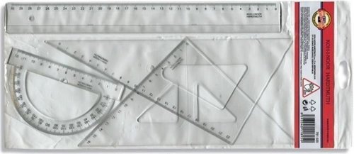 Súprava geometrická veľká pre ľavákov sa skladá z výrobkov: trojuholník 45/177 s kolmicou, trojuholník 60/250, pravítko 30 cm a uhlomer 180/125. Všetky výrobky sú vyrobené z číreho priehľadného polystyrénu. Stupnice sú zhotovené technológiou presnej sieťotlače, ktorá je pri bežnom používaní odolná proti opotrebovaniu. Presnosť dĺžkových stupníc 0,2% dĺžky. Súprava je vhodná pre technické kreslenie, rysovanie a meranie priamok, úsečiek, rovnobežiek, kolmíc, uhlov, apod. v škole aj v kancelárii. Zásadný rozdiel oproti štandardu spočíva v otočení všetkých stupníc. Stupnice majú začiatok na pravej strane a číslované sú od pravej strany do ľava. Tým sú výrobky predurčené pre ľavákov. Výrobky sú zabalené do polotransparentného polypropylénového puzdra s potlačenou papierovou vložkou a eurozávesom. Na papierovej vložke je vytlačený hologram pre ľavoruké.