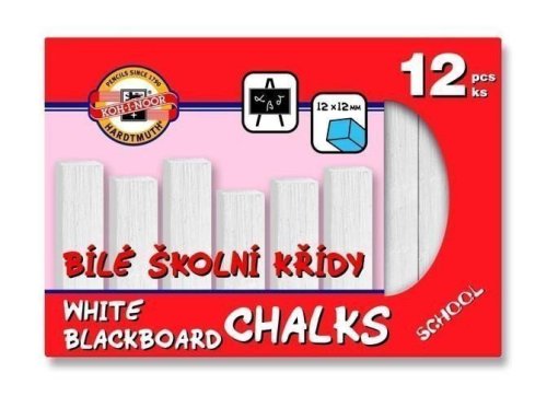 Sada 12 kusov školských bielych štvorhranných kried s rozmermi 12x12x100 mm, ktoré sú určené na písanie na školské tabule, vložených do krabičky s potlačenou manžetou a eurozávesom. Upozornenie. Nevhodné pre deti do 3 rokov. Možnosť odlomenia malých častí. Nebezpečenstvo zalknutia.