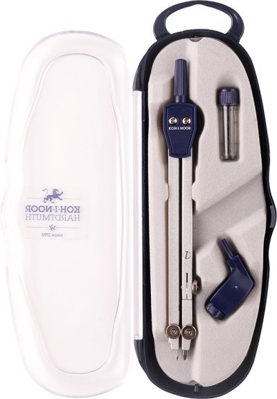 Školské kovové kružítko určené na rysovanie kružníc do priemeru 360 mm s upínacím priemerom 3,5 mm vrátane ceruzky s 2 náhradnými tuhami a univerzálneho nástavca (adaptéru) v krabičke z tvrdého plastu.