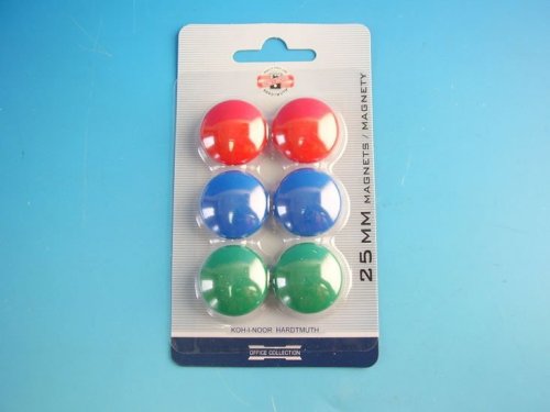 Okrúhle magnety 25 mm, priemer magnetu je 25 mm, výška 7 mm. Magnet je plastový, na spodnej strane je magnetická plôška. Mix farieb. T ks maghetov je uložené v blistri. Magnety sa používajú na pripevnenie napr. papiera na magnetickú tabuľu.
