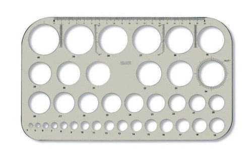 Kružnicová šablóna vyrobená z dymového priehľadného polystyrénu. Je predurčená na kreslenie kružníc s priemermi 4 až 40 mm po 1 mm pomocou ohrotenej ceruzky, mikroceruzky, versatilky alebo technických pier. Všetky kruhové otvory sú označené natlačenou číslicou s príslušným priemerom a osovým krížom. Ďalej sú na šablóne natlačené: dĺžková stupnica s dĺžkou 200 mm, uhlomerná stupnica 0 – 360°(á 5°), 2x uhlomerná stupnica 0 – 40°(á 1°) a stupnica pre rovnobežky. Tlač je prevedená technológiou presnej sieťotlače a pri bežnom používaní je odolná proti opotrebovaniu. Šablóna je určená na rysovanie a technické kreslenie v škole aj v kancelárii. Zabalená je do pelyetylénového vrecka s eurozávesom.