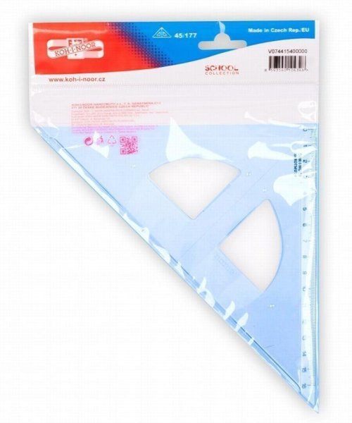 Trojuholník 45/177 s kolmicou vyrobený z modrého priehľadného polystyrénu. Stupnica je narazená technológiou horúcej razby. Presnosť stupnice 0,2% dĺžky. Mimo dĺžkovej stupnice je vybavený aj ryskou na konštruovanie kolmíc. Trojuholník je určený na rysovanie a technické kreslenie v škole aj v kancelárii. Zabalený je do polyetylénového vrecka s eurozávesom.