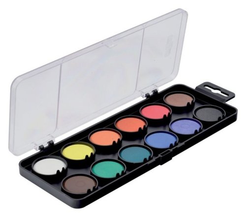Školské vodové farby 12tich odtieňov s tabletami s priemerom 3 cm v obdĺžnikových, plastových, jednoposchodových farebníkoch s transparentným viečkom. Farby sú výrazné, vyznačujú sa svojim vysokým obsahom pigmentov. Sú certifikované a úplne bezpečné pre deti.