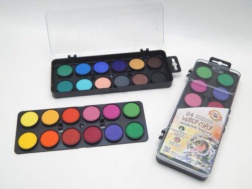 Školské vodové farby 24 odtieňov s tabletami s priemerom 30 mm v obdĺžnikových, dvojposchodových, plastových farebníkoch s papierovou vložkou. Farby sú radené v dvoch poschodiach po 12tich odtieňoch, majú vysoký obsah pigmentu. Sú certifikované a úplne bezpečné pre deti.