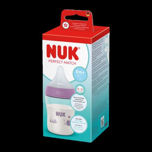 Dojčenská fľaša NUK Perfect Match s kontrolou teploty a mäkkým silikónovým cumlíkom. Špeciálny tvar typický pre cumlíky NUK s ortodontickým antikolikovým cumlíkom je modelovaný podľa materskej bradavky pri dojčení. Ponecháva dostatok priestoru pre prirodzené sacie pohyby jazyka aj čeľuste. Veľká, široká opora pier pri pití pripomína matkinu pokožku. Fľaštička je navrhnutá tak, aby bábätko neprišlo do kontaktu s pevnými plastovými časťami. Vylepšený systém proti prehĺtaniu vzduchu pri pití Anti Colic Air System zaisťuje prirodzený tok mlieka, aby dieťa pilo uvoľnene bez prehĺtania vzduchu. Hladko sa zužujúci tvar s antikolikovou funkciou pre plynulý a nerušený prietok pitia, veľkosť S (od narodenia, pre materské mlieko, čaj alebo vodu). Dojčenské fľaše sú teraz vybavené novou NUK kontrolkou teploty a pomáhajú tak zabrániť tomu, aby vaše dieťa pilo príliš horúci príkrm. Kontrolka vyzerá ako teplomer, je umiestnená medzi ryskami a teplota obsahu fľaše zmení jej farbu. Pokiaľ je príkrm príliš horúci, modrá kontrolka sa zmení na bielu. V ideálnom prípade by mal príkrm mať telesnú teplotu (37 °C), čo zodpovedá modrému zafarbeniu displeja. Vyrobená z vysoko kvalitného nerozbitného plastu polypropylénu a neobsahuje BPA (Bisfenol A). Obsah fľaše 150 ml. Vhodná pre deti od narodenia, S (malý otvor = pre materské mlieko, vodu, čaj). Klinicky testované.<BR>Charekteristika:<BR>- praktický displej NUK kontroly teploty, ktorý zmení teplotu z modrej (studené) na<BR>bielu (príliš horúce)<BR>- trvalo hygienická fľaša so vzhľadom vysoko kvalitného plastu, príjemná na dotyk<BR>- bez škodlivých látok a zápachu – neobsahuje BPA<BR>- bezpečné uchopenie a stabilita – vďaka jemne vytvarovanej fľaši a širokej základni<BR>- neobmedzený počet kombinácií – je možné kombinovať so všetkým príslušenstvom odsávačiek materského mlieka NUK Perfect Match a NUK Soft&Easy-nekvapkajúce-vďaka viečku fľaša netečie a cumlík je chránená pred znečistením. Dojčenské fľaše sú v súlade s európskou normou EN14350.