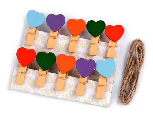 Drevené štipce so srdiečkami v pestrých farbách sa zapáčia predovšetkým deťom a potešia aj zamilované. Použitie: Veselá dekorácia oživí predovšetkým detské izbičky. Stačí len natiahnuť šnúrku a kolíčkom prichytiť obľúbené fotografie vašich najmenších. Tiež kresby, ktoré vytvoria vaši malí umelci, nájdu na šnúrke svoje miesto. Dekoračné štipce môžete použiť na uchytenie menoviek pri určovaní zasadacieho poriadku pri svadobnom stole. Balenie obsahuje: štipce so srdiečkom, šnúrku o dĺžke cca 100 cm Variant č. 1 má v balení 12 ks štipcov. Variant č. 2 má v balení 10 ks kolíčkov.