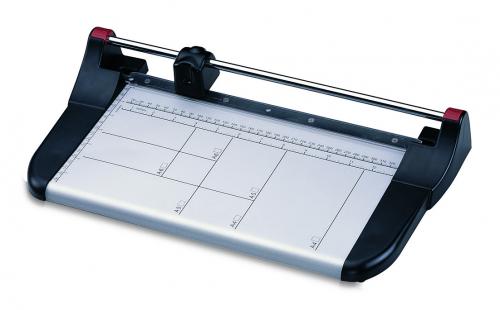 Kvalitná koliesková rezačka s pevnou kovovou základňou a reznou hlavou umiestnenou na kovovej tyči, určená pre formát A4. Pracovný stôl je vybavený natlačenými mierkami a prítlačnou lištou z priehľadného plastu.