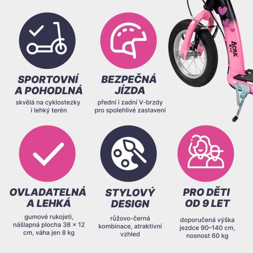 Uľahčite deťom cestu do školy, naplánujte s nimi výlet alebo sa len tak prejdite po okolí. Kolobežka Acra Joy Grace sa hodí na jazdu na ceste, cyklotrase aj v nenáročnom teréne. Poteší nielen pokročilých jazdcov, ale aj začiatočníkov. Je vhodná pre každého od 9 rokov s výškou až do 140 cm .