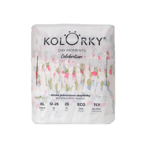 KOLORKY DAY MOMENTS sú veľmi tenké a sú určené pre každý moment s vašimi najmenšími. Vďaka svojmu strihu neobmedzujú bábätko v pohybe. Sú vyrobené z prírodných a obnoviteľných materiálov, neobsahujú parfémy, ftaláty ani iné škodlivé látky. Technológia Flash dry zaručuje, že tekutina je rýchlo odvedená od pokožky bábätka a pevne uzamyká v jadre nielen tekutiny, ale aj zápach. Absorpčné kanáliky navyše zaisťujú, že sa tekutina rovnomerne rozprestrie po celom savom jadre a nehromadí sa na jednom mieste. Plienky majú tiež indikátor vlhkosti, ktorý vám napovie, že je bábätko potrebné prebaliť. Dizajn je plný farebných konfiet a nesie názov Celebration, pretože každý moment s vašim dieťaťom si zaslúži osláviť.
