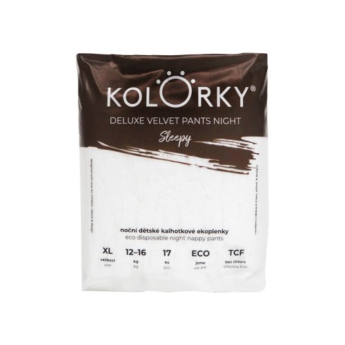 KOLORKY DELUXE VELVET PANTS NIGHT sú nočné nohavičkové plienky, ktoré sú určené pre pokojnú noc vašich malých neposedov. Plienky majú zamatový povrch, vyššiu absorpčnú vrstvu, pružné bočné manžety, elastický pás a indikátor vlhkosti. Pre ľahšiu výmenu plienky sa dá elastický pás po strane ľahko roztrhnúť, lepiaci pásik potom uľahčí zabalenie použitej plienky. Dizajn Sleepy vykúzli úsmev na tvári detí i dospelých. Plienky sú vyrobené z prírodných a obnoviteľných materiálov, ktoré sú bielené horúcim vzduchom úplne bez použitia chlóru metódou TCF (total chlorine free), tým sú šetrné k zdraviu a pokožke vášho dieťaťa. Plienky sú vyvinuté v SR, dermatologicky testované a certifikované Štátnym zdravotným ústavom - SZÚ.