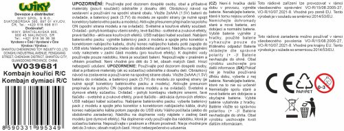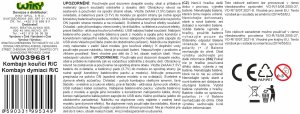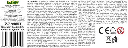 Kombajn dymiace RC na diaľkové ovládanie. Veľkosť 28 cm. Frekvencia 2.4GHz. Svetelné, zvukové a dymové efekty. 3.7V 500mAh batériový pack do kombajnu súčasťou, 2xAAA do ovládača nie sú súčasťou. USB kábel, nádobka na vodu súčasťou. Nádržka v zadnej vrchnej časti kombajnu. Prepínač ON/OFF na spodnej strane kombajnu a na ovládači. Ovládač - ľavé tlačidlo - svetelné a zvukové efekty, pravé tlačidlo - dymové efekty. Obrázkový návod na zostavenie a používanie na spodnej strane obalu.