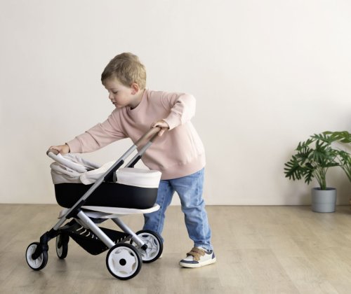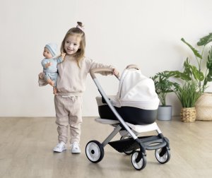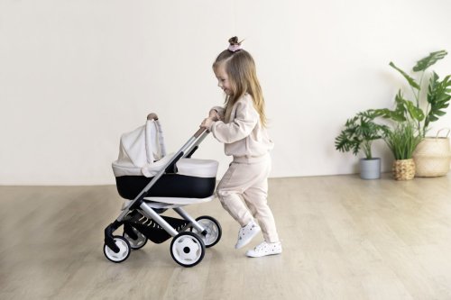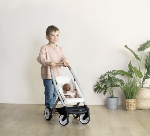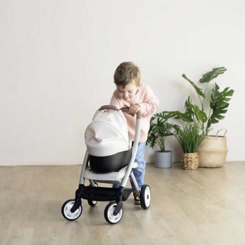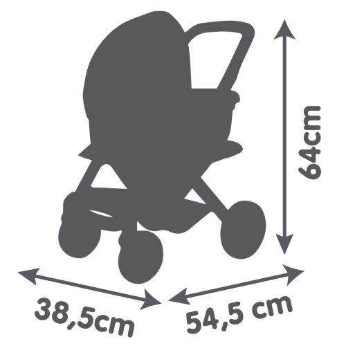 Všestranný kočík pre bábiky 3 v 1. Moderný multifunkčný kočík pre bábiky je možné vďaka vymeniteľnej korbičke behom chvíľky prestavať na praktický športový kočík pre bábiky. Vrchnú časť je možné v niekoľkých jednoduchých krokoch zložiť a bábiku so sebou vziať kamkoľvek pôjdete v praktickom košíku. Poťahy kočíka sú vyrobené z robustnej plastovej tkaniny. Na čistenie je možné ľahko utrieť vlhkou handričkou. Pre bábiky do veľkosti 42 cm. Bábika nie je súčasťou balenia. Výška k ergonomickej rukoväti je 65 cm. Predné kolieska otočné, kolieska s protihlukovou vrstvou. Priemer koliesok 15,5 cm a 12,5 cm. Rozmery produktu (DxŠxV): 54,5 x 38,5 x 64 cm.