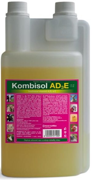 Problém: Pri nedostatku vitamínu A dochádza k obmedzeniu sekrécie ochranného hlienu v dýchacích cestách a črevách, čo zvyšuje náchylnosť k zápalu pľúc a čriev ak poruche funkcie epitelových buniek slizníc, žliaz a kože s prejavmi porúch, ktoré zodpovedajú funkcii príslušných orgánov. Pri nedostatku vitamínu D dochádza k zníženiu úrovne ukladania minerálnych látok alebo k demineralizácii kostí. U hydiny spôsobuje nedostatok vitamínu D zlú kvalitu škrupín. Pri nedostatku vitamínu E dochádza vplyvom zvýšenej tvorby toxických peroxidov k deštrukcii bunkových membrán, čo má za následok degeneráciu najmä kostrovej a srdcovej svaloviny, pečene, mozgu a ciev. Nedostatočné hladiny týchto vitamínov znižujú úžitkovosť zvierat. Zloženie v 1 ml: vitamín A 50 000 IU , vitamín D3 10 000 IU , vitamín E 100 mg. Spôsob aplikácie: Kombisol AD3E sa pridáva do pitnej vody alebo mlieka preventívne v odporúčanej dávke po dobu 5 – 10 dní. Roztok je nutné pripravovať denne čerstvý, chrániť pred priamym slnečným svetlom a čo najrýchlejšie spotrebovať. Nepodávať neriedený prípravok! Dávkovanie:
