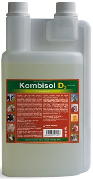 Problém: Pri nedostatku vitamínu D dochádza k zníženiu úrovne ukladania minerálnych látok do rastúcich kostí mláďat, čo vedie k ich deformácii a zvýšenej lámavosti. Ochorenie sa označuje ako krivica (rachitis). U dospelých zvierat nedostatok vitamínu D spôsobuje demineralizáciu, ktorá je nazývaná mäknutím (osteomalácia) alebo rednutím kostí (osteoporóza). Tieto stavy sú pozorované najmä v čase gravidity a laktácie. Pri prudkom nástupe vysokej produkcie mlieka na začiatku laktácie môže dôjsť vplyvom nedostatku vitamínu D k mliečnej horúčke. U hydiny sa stretávame s vplyvom nedostatku vitamínu D na kvalitu vaječnej škrupiny. Zloženie v 1 ml: vitamín D3 100 000 oi . Spôsob aplikácie: U cicavcov sa Kombisol D3 pridáva do pitnej vody alebo mlieka spravidla po dobu 10 – 20 dní. U hydiny je vhodné podávať liek v pravidelných intervaloch napr. počas 2 – 3 dní. Dĺžka intervalu medzi podaním závisí od rýchlosti rastu a od zdravotného stavu, spravidla 1 – 2 týždne. (V prvých desiatich dňoch odporúča dodávateľ u brojlerových kurčiat zvýšiť dávku na 500 – 1000 IU na kus/ deň * po dobu max. 3 dní, potom dávkovanie znížiť). Roztok je nutné pripravovať denne čerstvý, chrániť pred priamym slnečným svetlom a čo najrýchlejšie spotrebovať. Pokiaľ je dávkovanie príliš nízke (desatiny, stotiny, tisíciny ml) je nutné vykonať nariedenie podľa potreby (10x, 100x, 1000x), napr. prasa 80 kg = 0,04 ml, 4 ml sa zriedi vodou 100 x = vytvorí sa roztok, ktorý sa po riadnom premiešaní aplikuje v dávke 4 ml. Nepodávať neriedený prípravok! Dávkovanie: