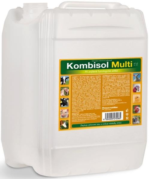 Problém: Pri zvýšenej fyziologickej záťaži dochádza v organizme k porušeniu vnútorného prostredia a sú naštartované metabolické procesy, ktoré vedú k jej obnoveniu. Mnohé pochody sú riadené hormónmi, ktoré vyžadujú pre svoju syntézu vitamíny. Ich nedostatok alebo nesprávna hladina takto znižuje úžitkovosť. Zloženie v 1 ml: vitamín A 5 000 IU , vitamín D3 500 IU , vitamín E 20 mg, cholínchlorid 100 mg, niacínamid 10 mg, D-panthenol 5 mg, vitamín B2 3 mg, vitamín B1 3 mg, vitamín B6 2 mg, vitamín K 1 mg, biotín 0,015 mg, vitamín B12 0,005 mg. Spôsob aplikácie: Kombisol Multi sa podáva zvieratám riadne rozriedený v pitnej vode alebo mlieku. Preventívne po dobu 5 – 15 dní v uvedených dávkach. Aplikáciu je možné opakovať po 3 – 4 týždňoch. Roztok je nutné pripravovať denne čerstvý, chrániť pred priamym slnečným svetlom a čo najrýchlejšie spotrebovať. Nepodávať neriedený prípravok! Dávkovanie: