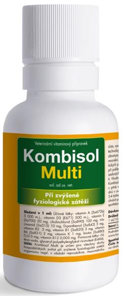 Problém: Pri zvýšenej fyziologickej záťaži dochádza v organizme k porušeniu vnútorného prostredia a sú naštartované metabolické procesy, ktoré vedú k jej obnoveniu. Mnohé pochody sú riadené hormónmi, ktoré vyžadujú pre svoju syntézu vitamíny. Ich nedostatok alebo nesprávna hladina takto znižuje úžitkovosť. Zloženie v 1 ml: vitamín A 5 000 IU , vitamín D3 500 IU , vitamín E 20 mg, cholínchlorid 100 mg, niacínamid 10 mg, D-panthenol 5 mg, vitamín B2 3 mg, vitamín B1 3 mg, vitamín B6 2 mg, vitamín K 1 mg, biotín 0,015 mg, vitamín B12 0,005 mg. Spôsob aplikácie: Kombisol Multi sa podáva zvieratám riadne rozriedený v pitnej vode alebo mlieku. Preventívne po dobu 5 – 15 dní v uvedených dávkach. Aplikáciu je možné opakovať po 3 – 4 týždňoch. Roztok je nutné pripravovať denne čerstvý, chrániť pred priamym slnečným svetlom a čo najrýchlejšie spotrebovať. Nepodávať neriedený prípravok! Dávkovanie: