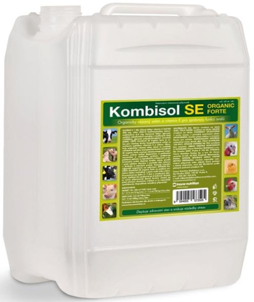 Problém: Nízka hladina selénu v kŕmnych surovinách a adekvátna potreba vitamínu E v období intenzívneho rastu alebo vysokej úžitkovosti zvyšuje nároky na ich doplnenie do kŕmnej dávky. Zloženie v 1 ml: vitamín E 200 mg, selén (hydroxyanalóg selenometionínu) 0,2 mg. Spôsob aplikácie: Kombisol SE organic forte sa podáva zvieratám riadne rozriedený v pitnej vode alebo mlieku. Možno ho použiť preventívne po dobu 3-7 dní v uvedených dávkach, aplikáciu je možné opakovať po 8 týždňoch. Roztok je nutné pripravovať denne čerstvý, chrániť pred priamym slnečným svetlom a čo najrýchlejšie spotrebovať. Nepodávať neriedený prípravok! Dávkovanie: