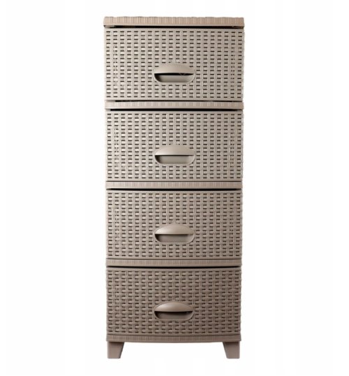 4 poschodová komoda vyrobená z plastovej elegantnej imitácie ratanu. Vhodná do kúpeľne, detskej izby. spálne, garáže, dielne, skladu a pod kamkoľvek, kde je kľúčový poriadok a štýl! Zosilnená konštrukcia - zvýšená stabilita, trvanlivosť a odolnosť. Pevný materiál – odolný voči vlhkosti, bez zápachu a ľahko sa čistí. Ratanový štýl – prírodný vzhľad, ktorý doplní akýkoľvek interiér. Ľahká a praktická - ľahko sa prenáša kamkoľvek. Samostatná montáž - všetko, čo potrebujete, je súčasťou balenia! Rozmery komody 37.5 x 44.5 x 94 cm. Farba cappuccina. EAN 8697806191326 / 0000040690704